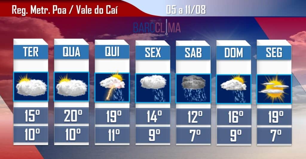 Quarta: Predomínio de nuvens com eventuais aberturas de sol. Min. 10°C. Máx. 20°C.