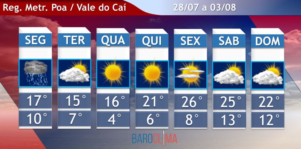 Segunda: Predomínio de nuvens com chuva ou garoa. ATENÇÃO: Devido a formação de um ciclone extratropical no oceano, ocorrem algumas rajadas de vento de intensidade moderada a forte, principalmente em Porto Alegre. A temperatura entra em queda durante o dia e a mínima ocorre à noite. Destacamos que o vento trará sensação térmica abaixo dos 10°C em alguns momentos do dia. Min. 10°C. Máx. 17°C.